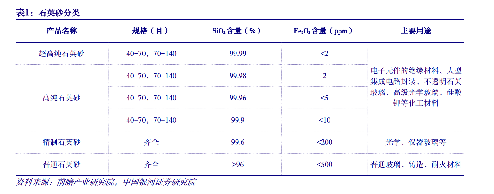 石英砂是石英石經(jīng)粉碎、篩選、酸洗、水洗、煅燒等工序制成的石英顆粒,我國一般通過石英砂的二氧化硅及氧化鐵含量的不同對(duì)其進(jìn)行細(xì)分,主要分為普通石英砂、精制石英砂、高純石英砂和超高純石英砂。